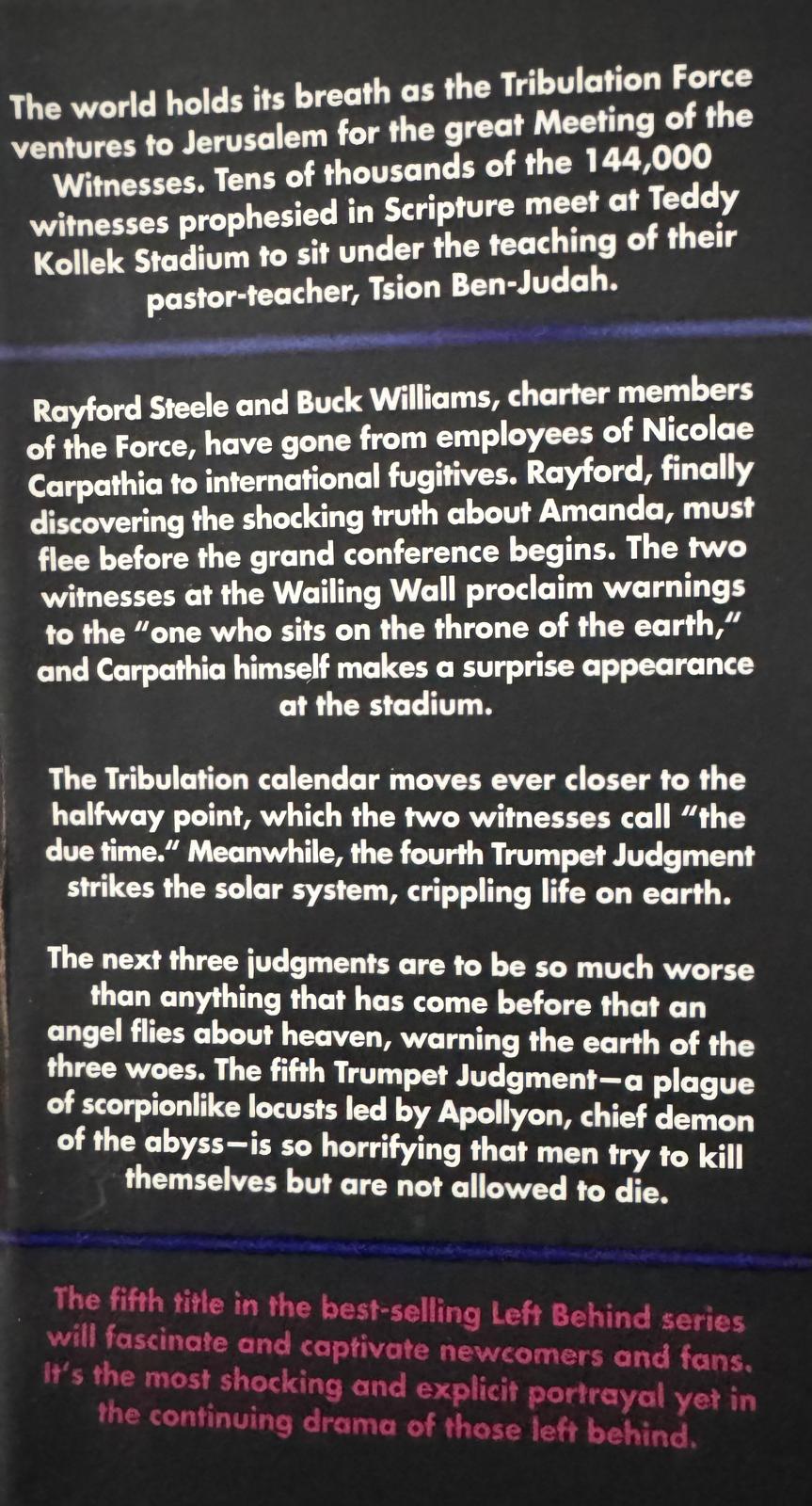 The world holds its breath as the Tribulation Force ventures to Jerusalem for the great Meeting of the Witnesses. Tens of thousands of the 144,000 witnesses prophesied in Scripture meet at Teddy Kollek Stadium to sit under the teaching of their pastor-teacher, Tsion Ben-Judah...