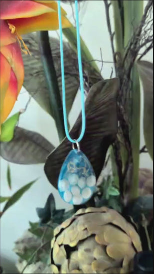 This handmade blue epoxy resin necklace & earring set shimmers with every move — lightweight, unique.
